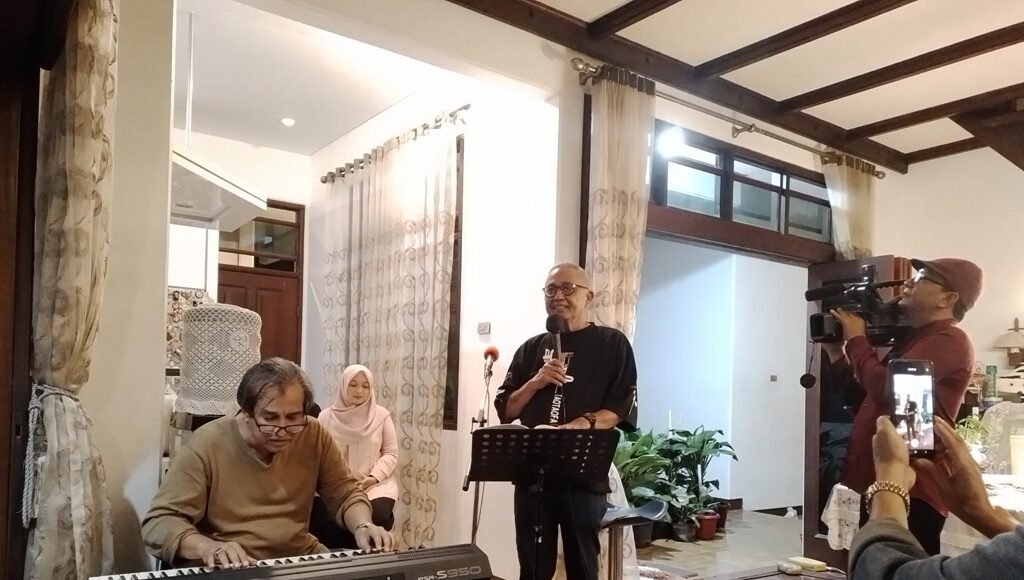 Di beranda belakang rumah yang menghadap kolam renang dalam hujan itu, para hadirin berbincang-bincang tentang dunia seni, ditutup dengan penampilan membaca puisi dan bernyanyi.