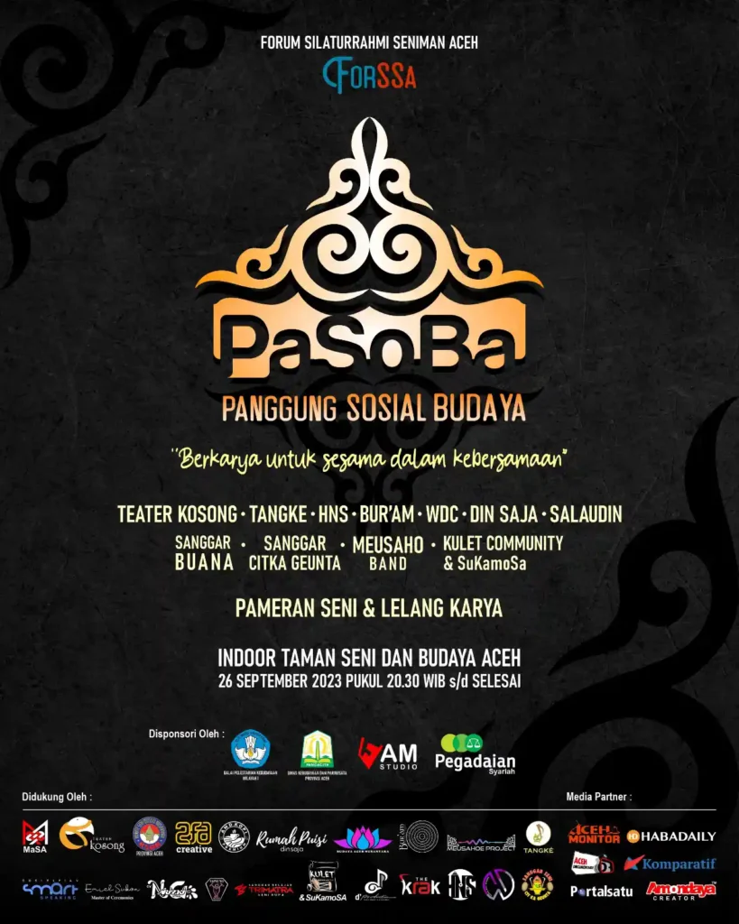 BANDA ACEH – Para seniman Aceh yang tergabung dalam Forum Silaturrahmi Seniman Aceh (ForSSa) mengadakan Panggung Sosial Budaya bertajuk ‘Berkarya untuk Sesama dalam Kebersamaan’. Acara tersebut dijadwalkan berlangsung pada Selasa, 26 September 2023, di Ruang Tertutup Gedung Taman Budaya Aceh mulai pukul 20.30 WIB sampai selesai, Senin (25/9/2023).
