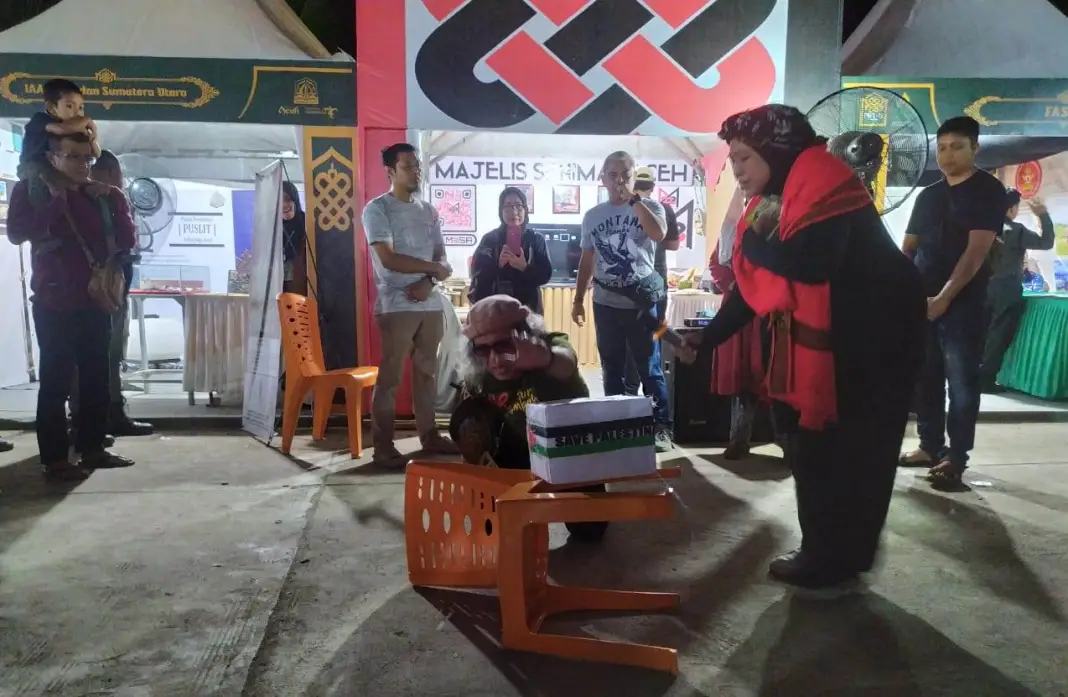 Untuk memeriahkan acara, beberapa hari setelah pembukaan, di hadapan stan, kami mengadakan pertunjukan seni, mengumpulkan bantuan untuk Palestina. Ada penampilan puisi, hikayat nyanyian, stan up komedi, dan lainnya.
